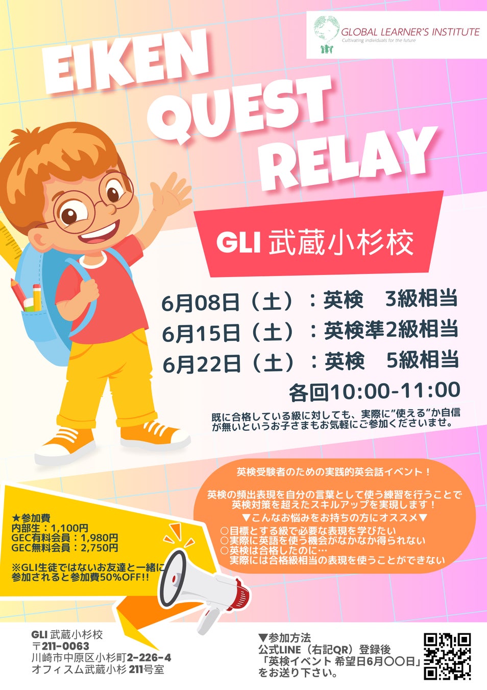 ※LINEにご登録後「英検イベント」のメッセージと参加ご希望の日程(例:6/22)とお送りください。
